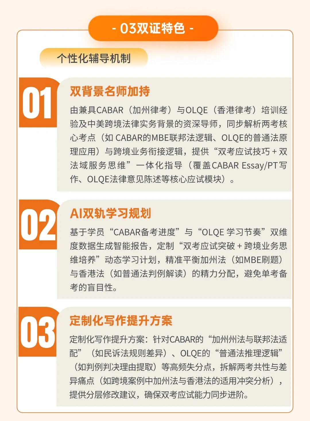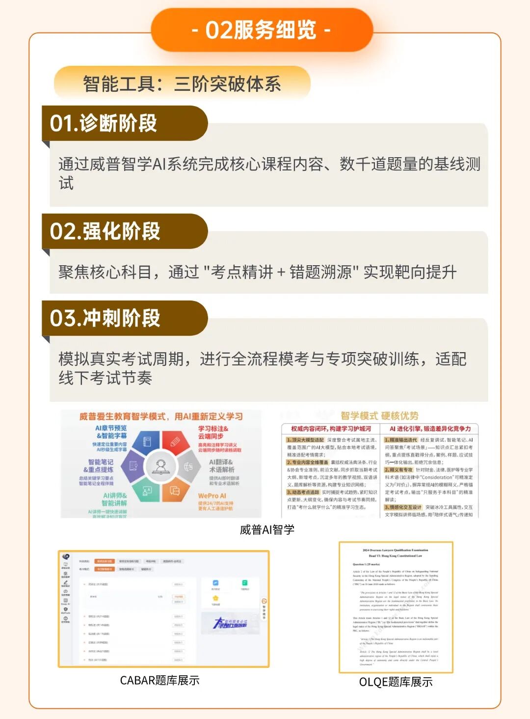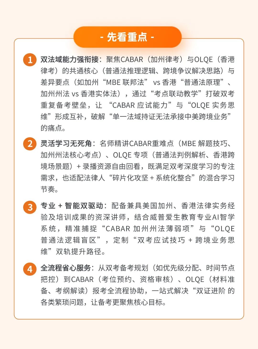 ✅专业+智学双buff:讲师既有美国加州、香港法律实务经验又懂双考培训,搭配威普自研AI智学系统,精准抓你“CABAR加州州法薄弱项”和“OLQE普通法逻辑盲区”,定制专属“双考应试+跨境业务思维”提升路径。