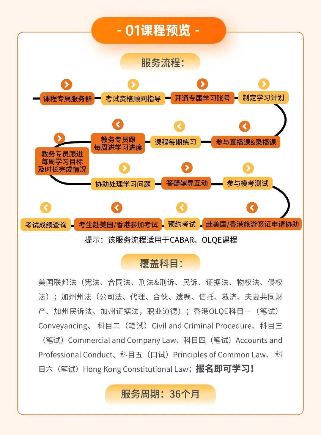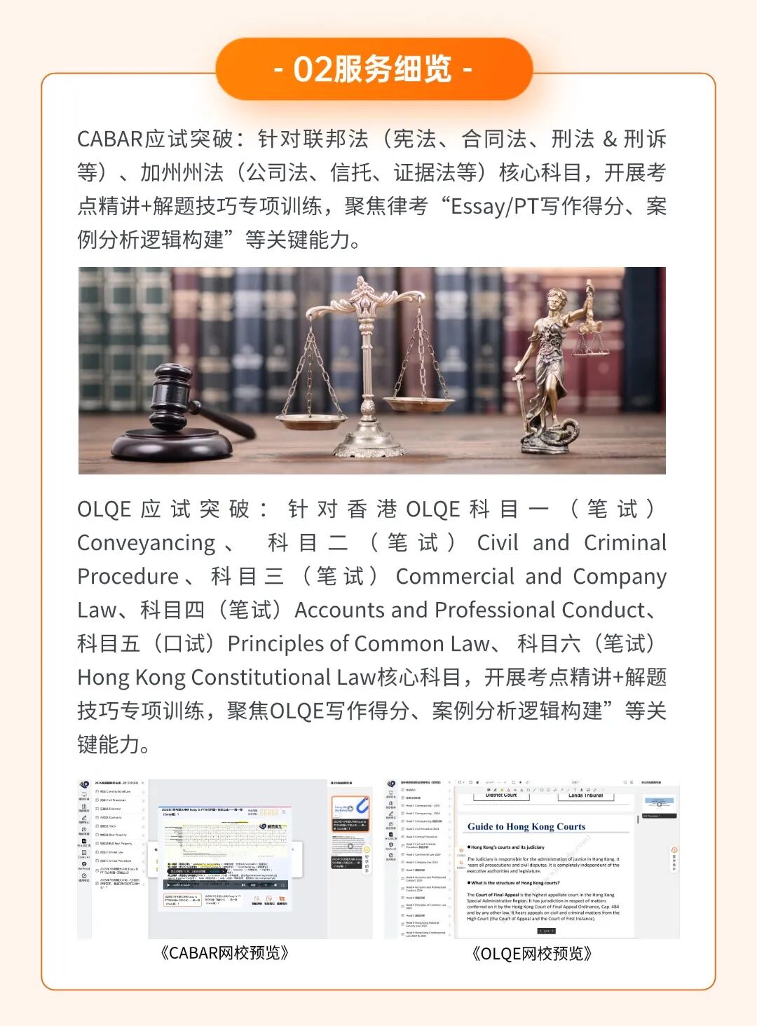 课程内容:CABAR针对联邦法、加州州法开展考点精讲+解题技巧训练;OLQE针对香港律考6大科目专项突破,Essay/PT写作、案例分析逻辑这些关键能力都重点练。