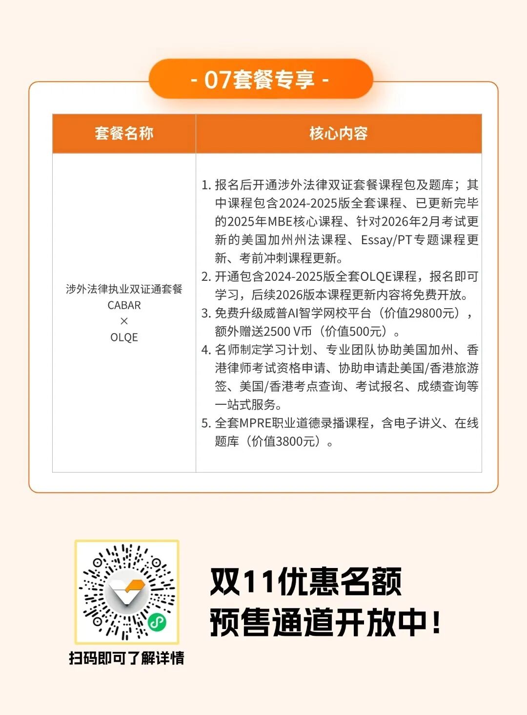 威普爱生教育的【CABAR×OLQE涉外法律执业双证通套餐】现在双十一优惠价¥39800,帮你圆梦三证律师!提高职业天花板!