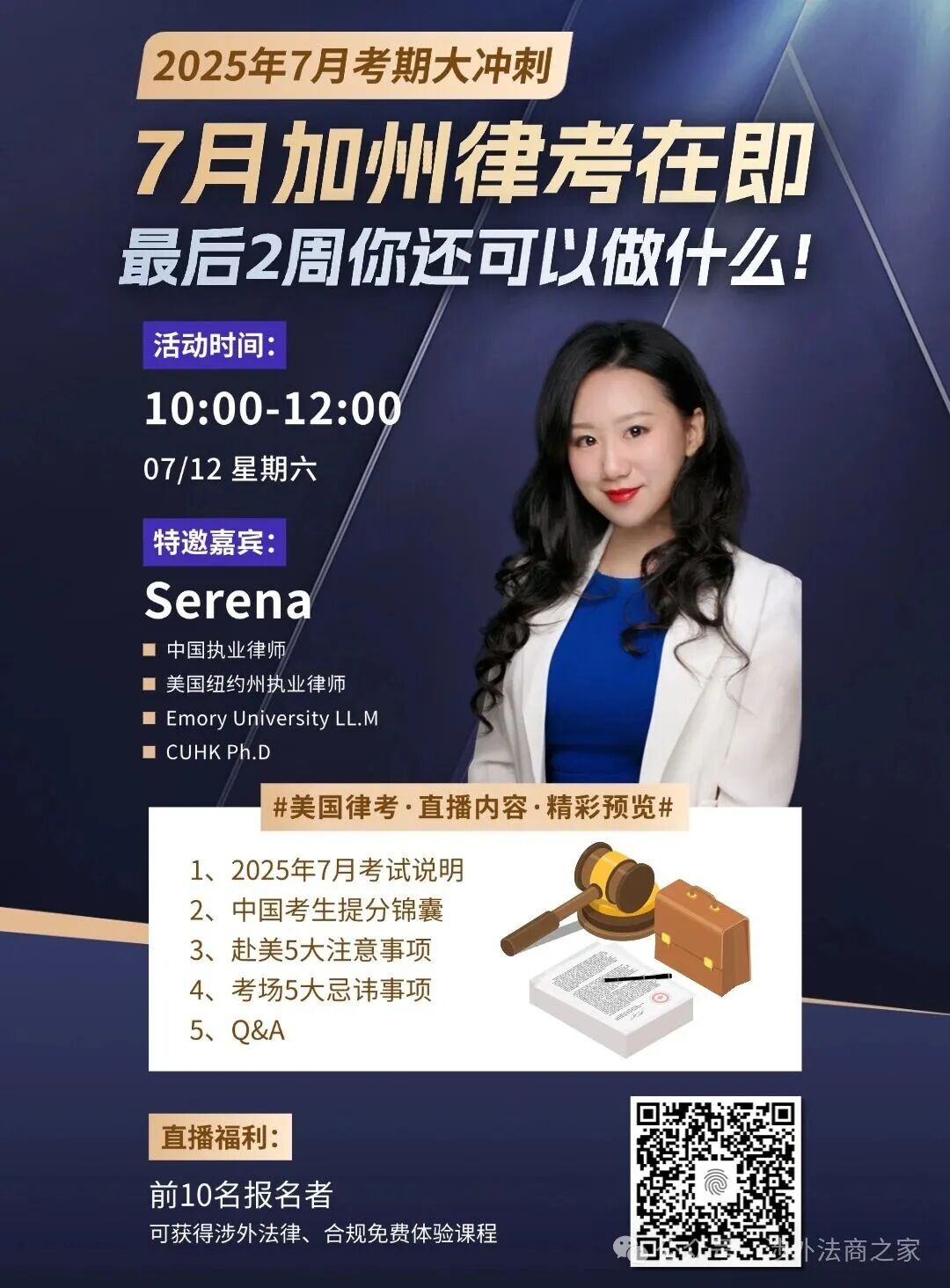加州证据法(Evidence)核心考点冲刺课(限时1小时公开课),助力2026年2月加州律考!为了让大家顺利备考“CABAR加州律师考试”,特别邀请金牌讲师Serena与我们分享关于CABAR的精彩内容。欢迎扫码预约直播!