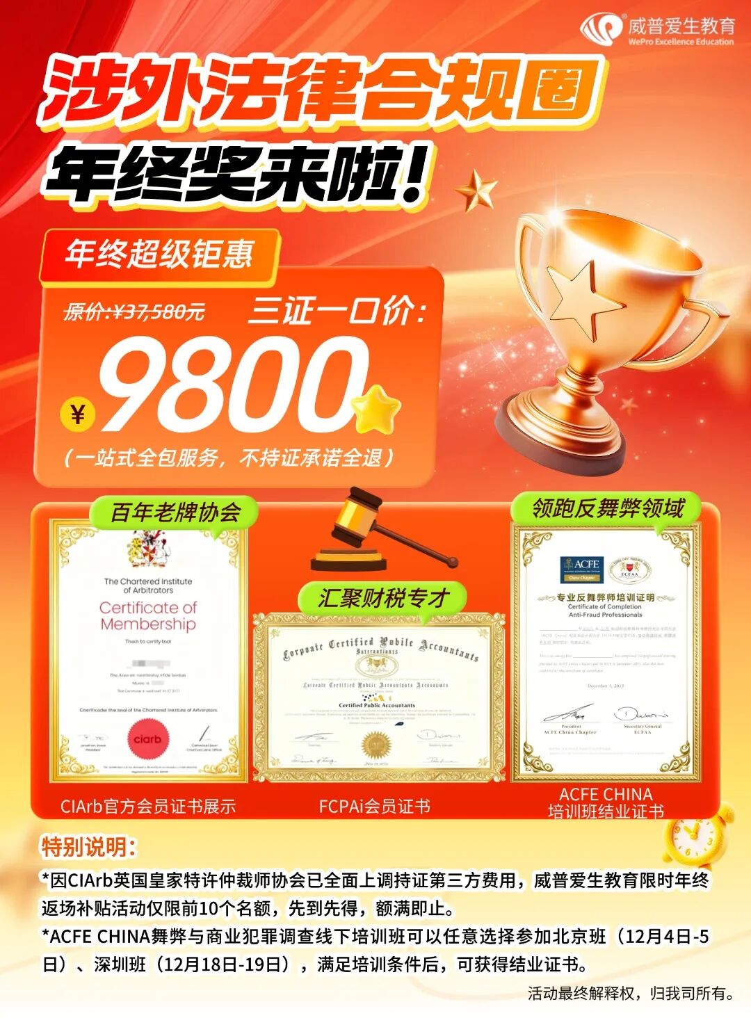 想成为一名英国皇家特许仲裁师的小伙伴可以选择我们!通过威普爱生教育报名可免考获得ACIARB证书!现课程优惠价¥9800,还送FCPAi+ACFE China证书!报名/咨询请添加小律:usbarlaw1