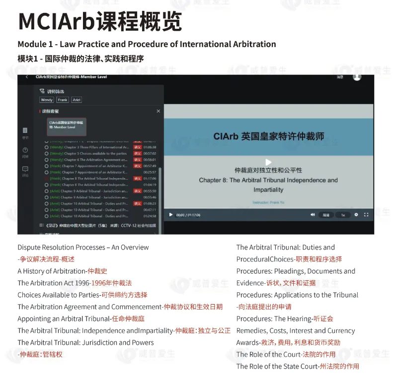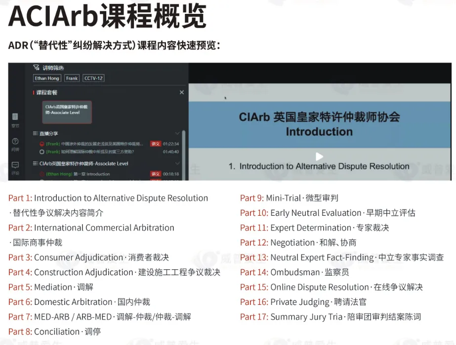 然后通过ADR课程学习,了解“替代性“纠纷解决方式的背景,描述各种形式的“替代性”争议解决的过程和程序,并加入CIArb成为优秀会员!