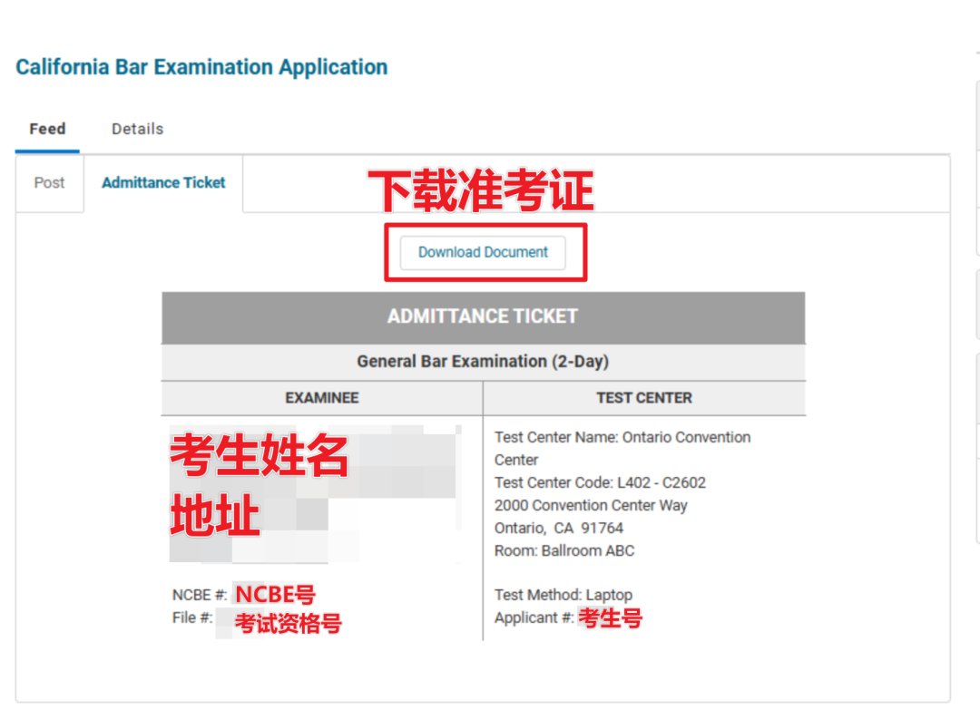 准考证上印有考生的考生编号(Applicant Number)和NCBE号码等信息,这些信息在考试期间也必须写在考试材料上。