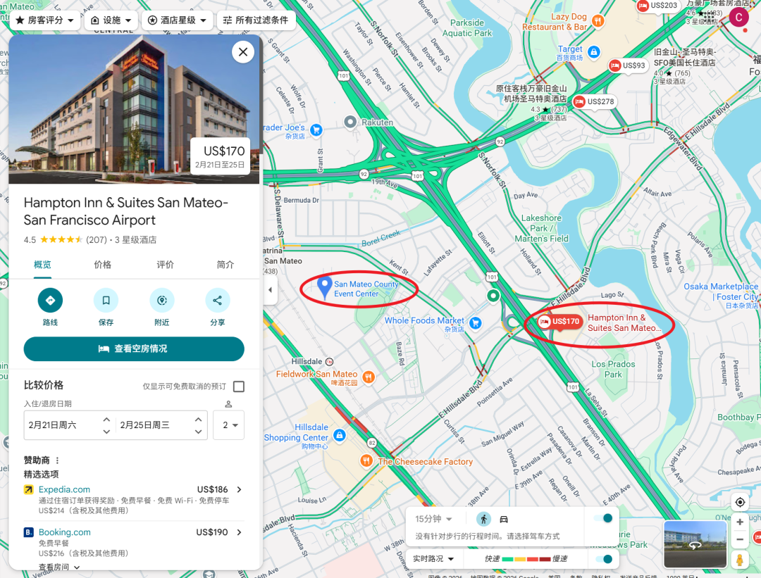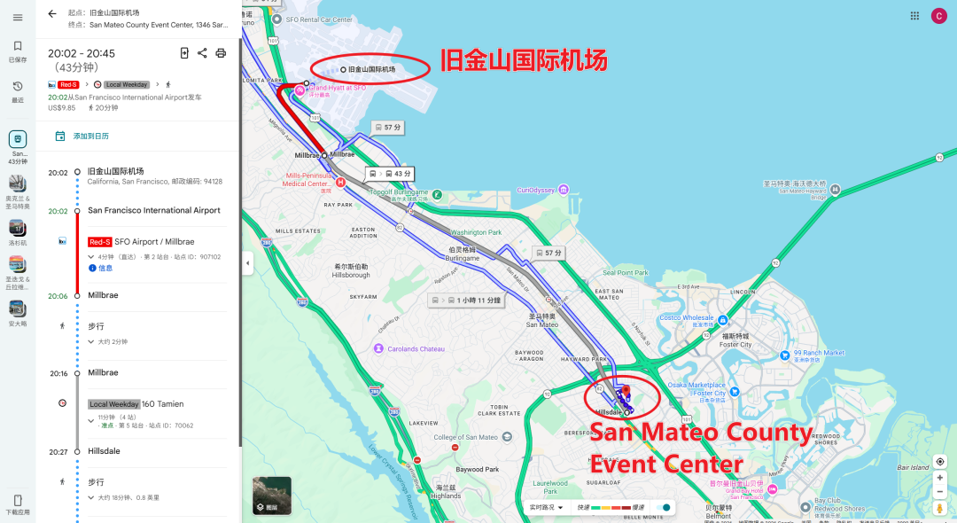 UBER 和 Lyft:直接从机场打车至San Mateo County Event Center,车程10.1英里约15分钟。