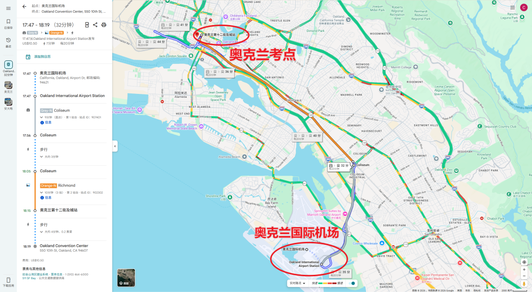 BART(Bay Area Rapid Transit):从奥克兰国际机场出发,乘坐73路公交(方向:Eastmont Transit Center),乘坐8站,耗时约12 分钟,在Coliseum BART站下车。步行约2分钟,到达Coliseum BART换乘站。
