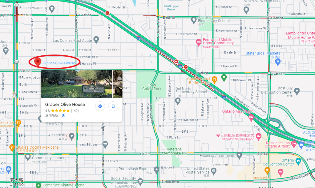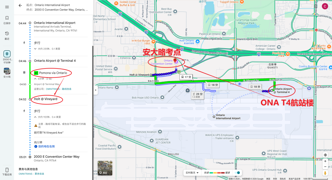 公共交通:从安大略国际机场出发,步行约2分钟(约0.1英里),到达Ontario Airport @ Terminal 4公交站。在Ontario Airport @ Terminal 4站,乘坐61路公交(方向:Pomona via Ontario),乘坐12站,耗时约8分钟,在Holt @ Vineyard站下车。从Holt @ Vineyard站步行约9分钟(约0.4英里),即可到达Ontario Convention Center。