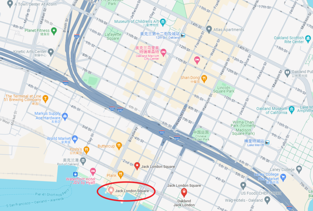 Jack London Square:奥克兰的一个热门水边区域,有很多餐厅、酒吧和娱乐活动。