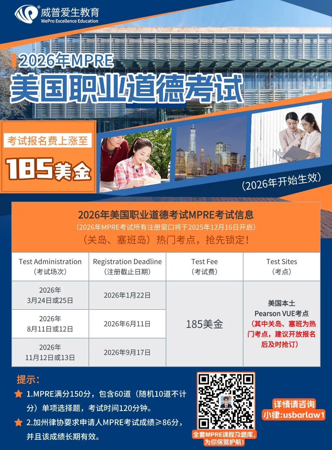 2026年8月的MPRE考试报名将在6月11日截止!想考的小伙伴,抓紧时间上NCBE官网报名,提前选好心仪的考点,名额有限,先到先得哦!