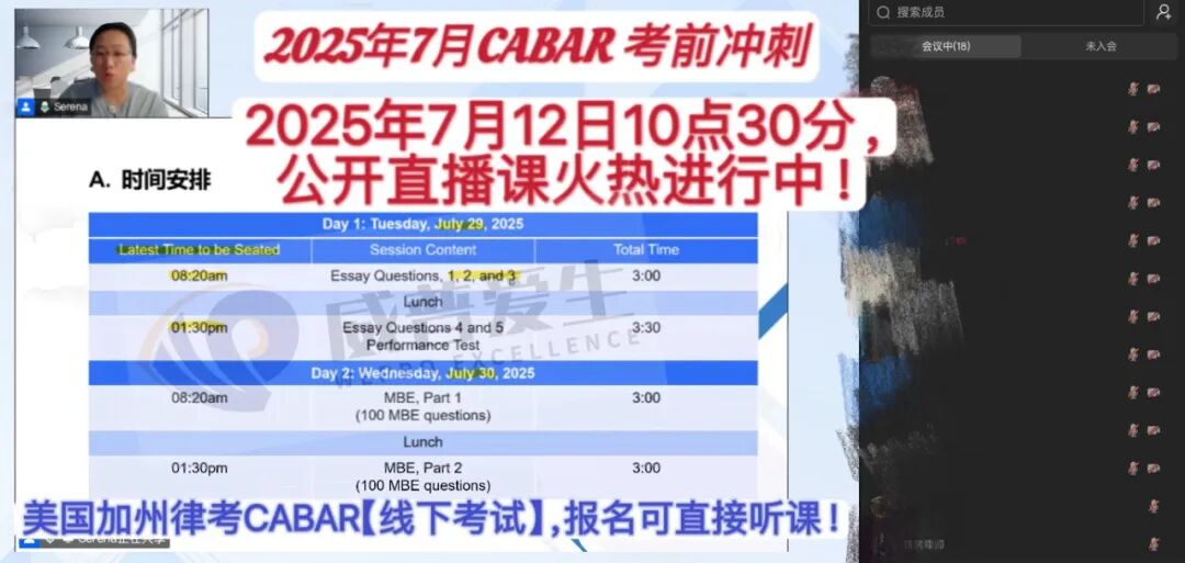 为了更好地应对2026年2月&7月美国加州律考CABAR,我们也上线了一系列直播课程(包含公开课及内部学员专属直播)目前Serena老师的USBAR美国律考系列直播持续更新中!