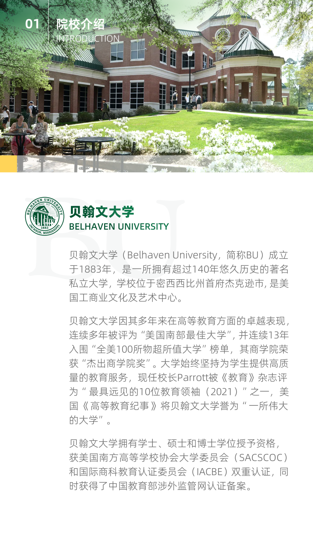 贝翰文大学(Belhaven University ,简称BU)成立于1883年,是一所拥有超过140年悠久历史的著名大学,学校位于密西西比州首府杰克逊市, 是美国工商业文化及艺术中心。