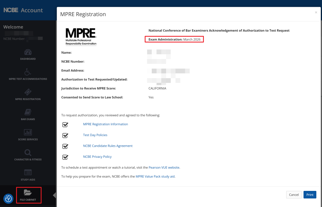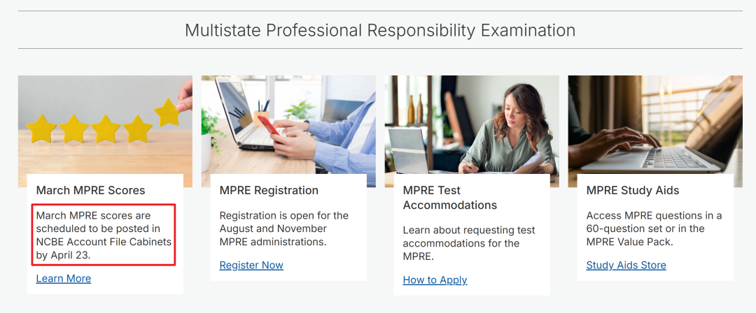 2026年3月24日、25日的MPRE职业道德考试成绩,将于4月23日后在NCBE Account - File Cabinets可查,需要提醒大家的是,通过MPRE考试(加州要求MPRE成绩≥86分,该成绩长期保持有效)是未来成为加州律师不可缺少的一部分。