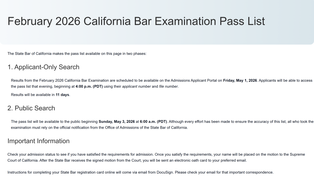 翘首以盼的2月美国加州律师考试成绩,将于美国太平洋(夏令时)时间5月1日下午4点后(北京时间5月2日早上7点后)可在Admissions Applicant Portal 平台输入考生号及考试资格号查询。而完整版考试合格名单将于美国太平洋(夏令时)时间5月3日早上6点后(北京时间5月3日晚上21点后)对公众开放。
