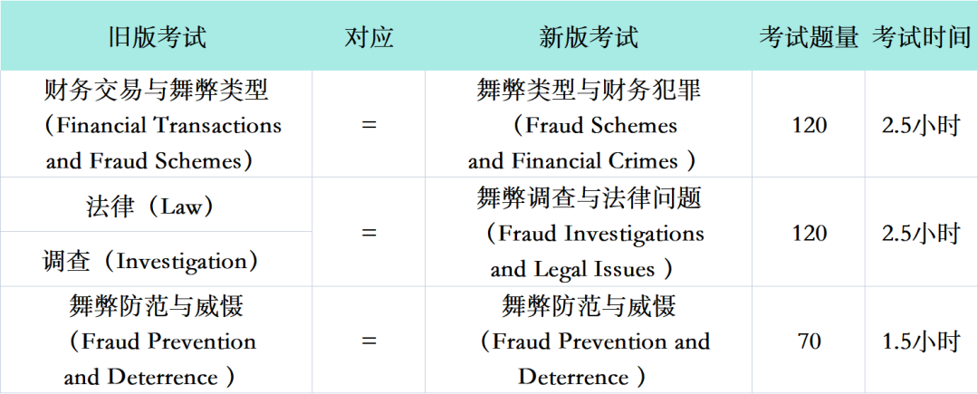只有通过旧考试中的“法律(Law)”和“调查(Investigation)”两部分考试,才能获得新考试中“舞弊调查与法律问题(Fraud Investigations and Legal Issues)”部分的学分。