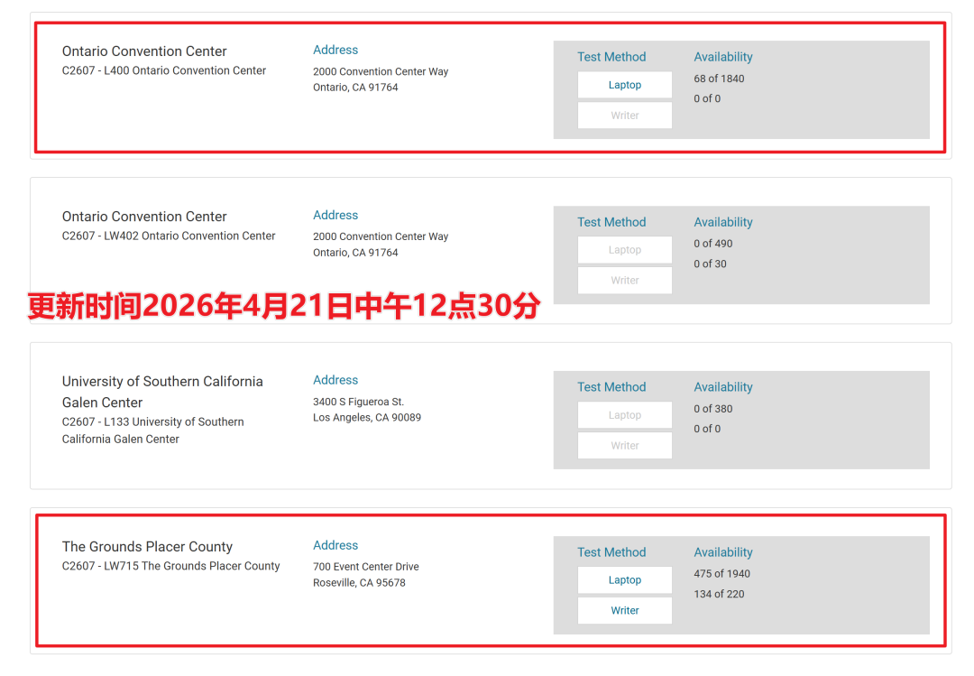 在2月考试成绩放榜前,官方还有Ontario、The Grounds Placer County这2个考点的考位供大家选择。