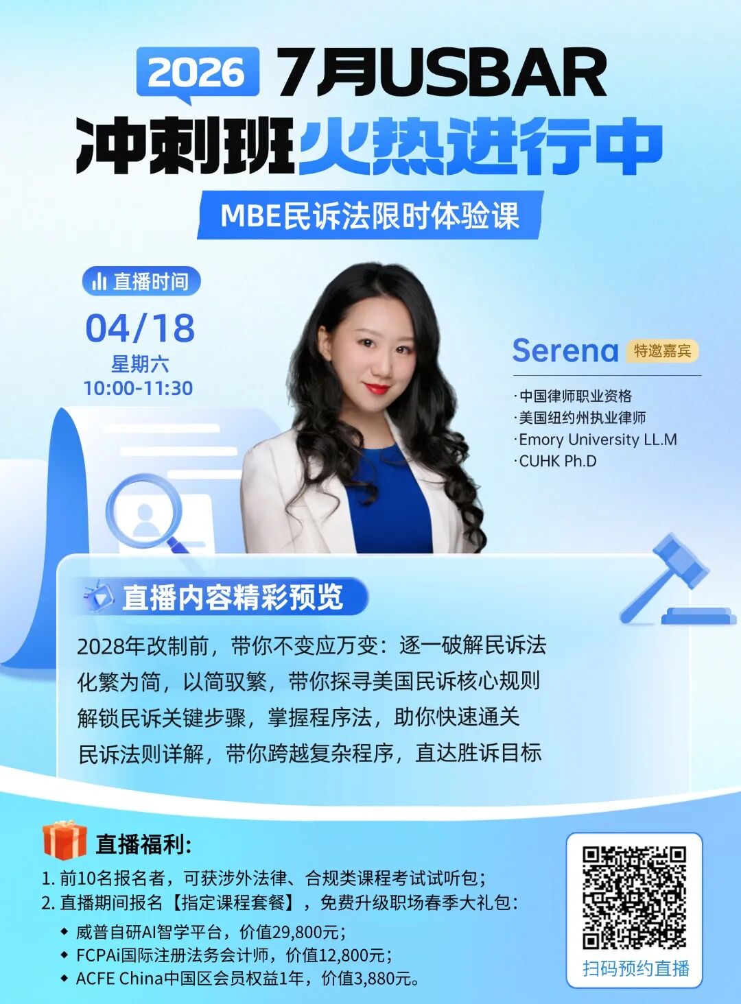 为了更好地应对2026年2月&7月美国加州律考CABAR,我们也上线了一系列直播课程(包含公开课及内部学员专属直播)目前Serena老师的USBAR美国律考系列直播持续更新中!