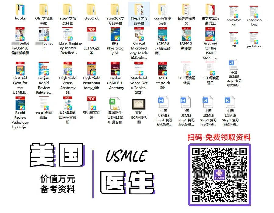 您还可以点击上方#小程序:海外医护交流圈#链接,获取USMLE美国医生考试的复习资料、精选考试样题和备考笔记,或在公众号后台留言咨询。医小护期待为您提供更多帮助!