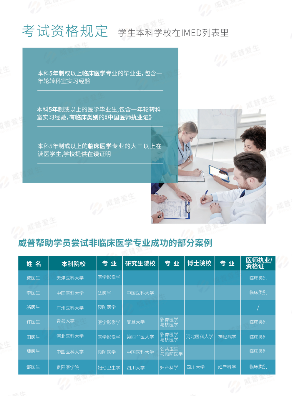 中国本科5年制或以上麻醉学、医学影像学、眼视光医学、儿科学、精神病学、放射医学专业的医学生(学校须在WHO名单上)