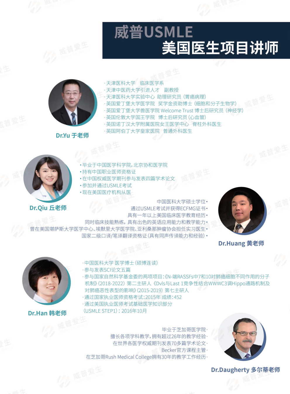 我们的师资团队由经验丰富、业内资深的医学专业人士组成,他们不仅精通USMLE考试的各个方面,更具备丰富的教学经验。他们深知考试的复杂性,因此制定了针对性强、深度广的教学计划,确保学生能够全面理解每个考试内容。