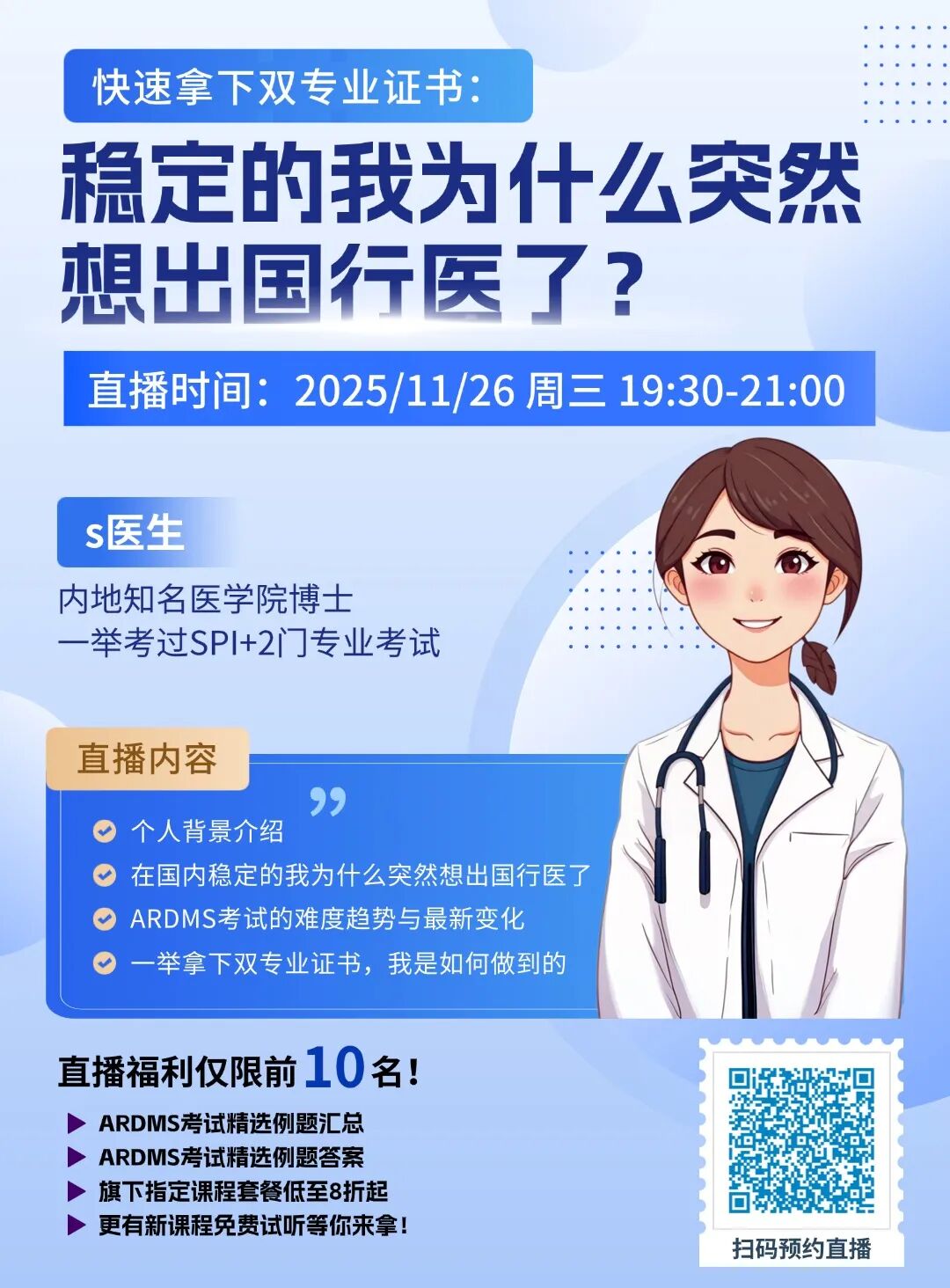 如果你也在寻找职业突破,或者想了解如何高效备考ARDMS双专业证书,这场直播或许能给你一些启发。她将在直播中一次讲透。机会难得,直播间等你!