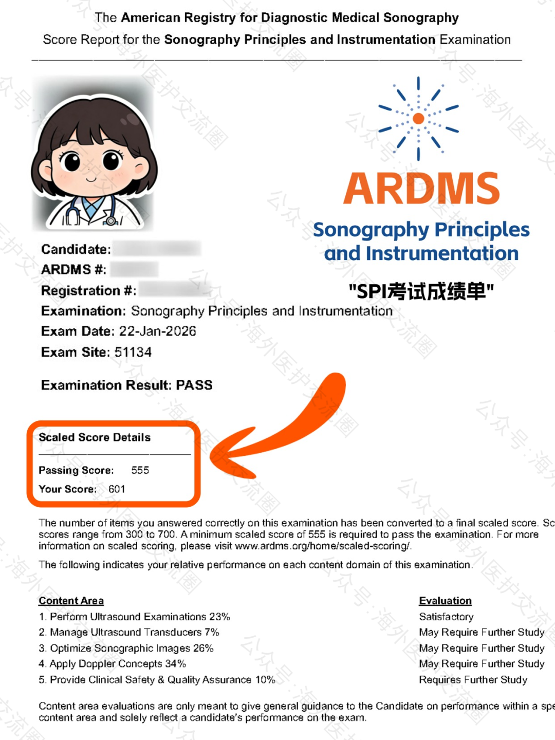 图片来自W同学分享:ARDMS-SPI考试成绩单