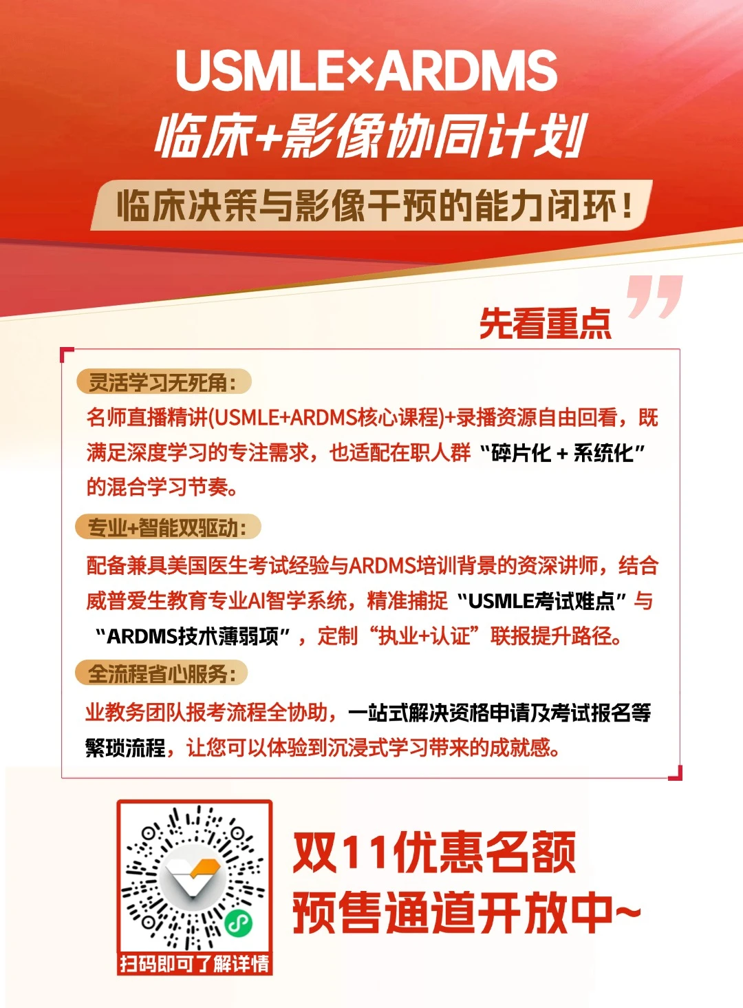 威普爱生教育推出,USMLE×ARDMS临床+影像协同计划,为医生和医学生打造从临床思维到影像判断的一体化进阶路径。