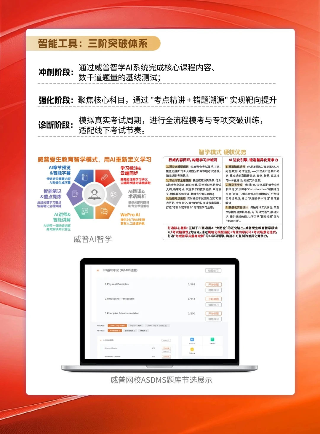 ✔专业与智能双驱动:讲师团队兼具USMLE与ARDMS双重背景,搭配威普AI智学系统,自动生成个性化学习路径,精准攻克薄弱点。
