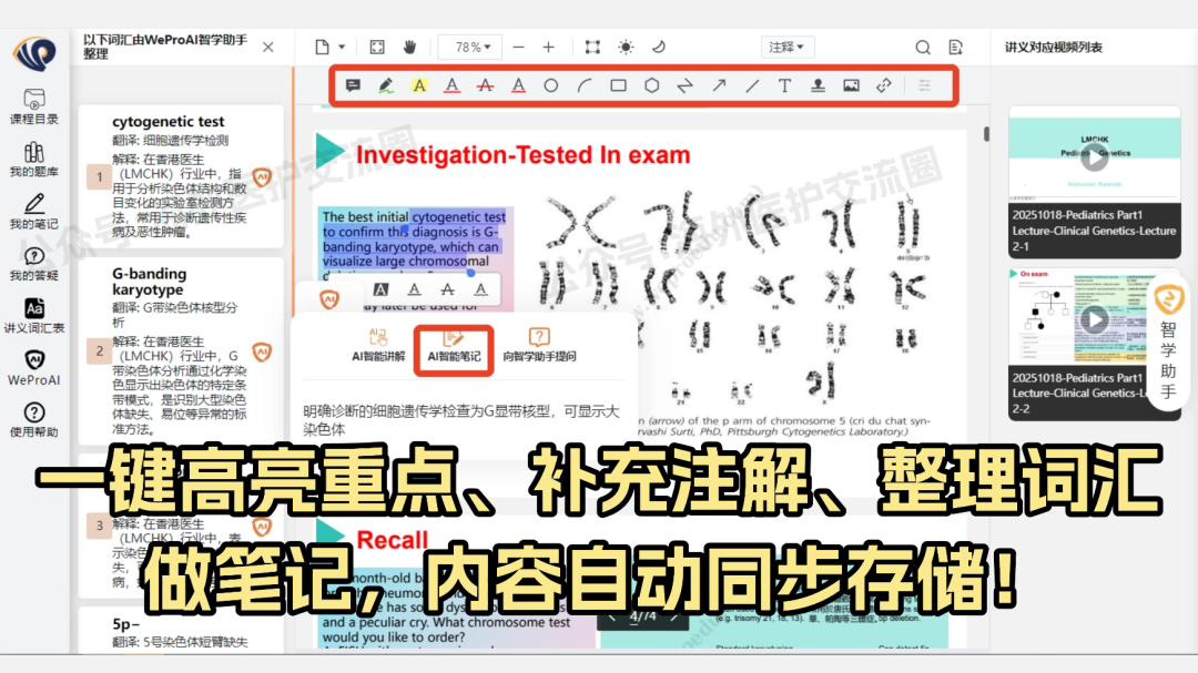 刷课的时候,我用AI系统即时标注,一键高亮重点、补充注解、做笔记,内容自动同步存储。复习的时候不需要再回头找影片片段,知识点一目了然,直奔重点。