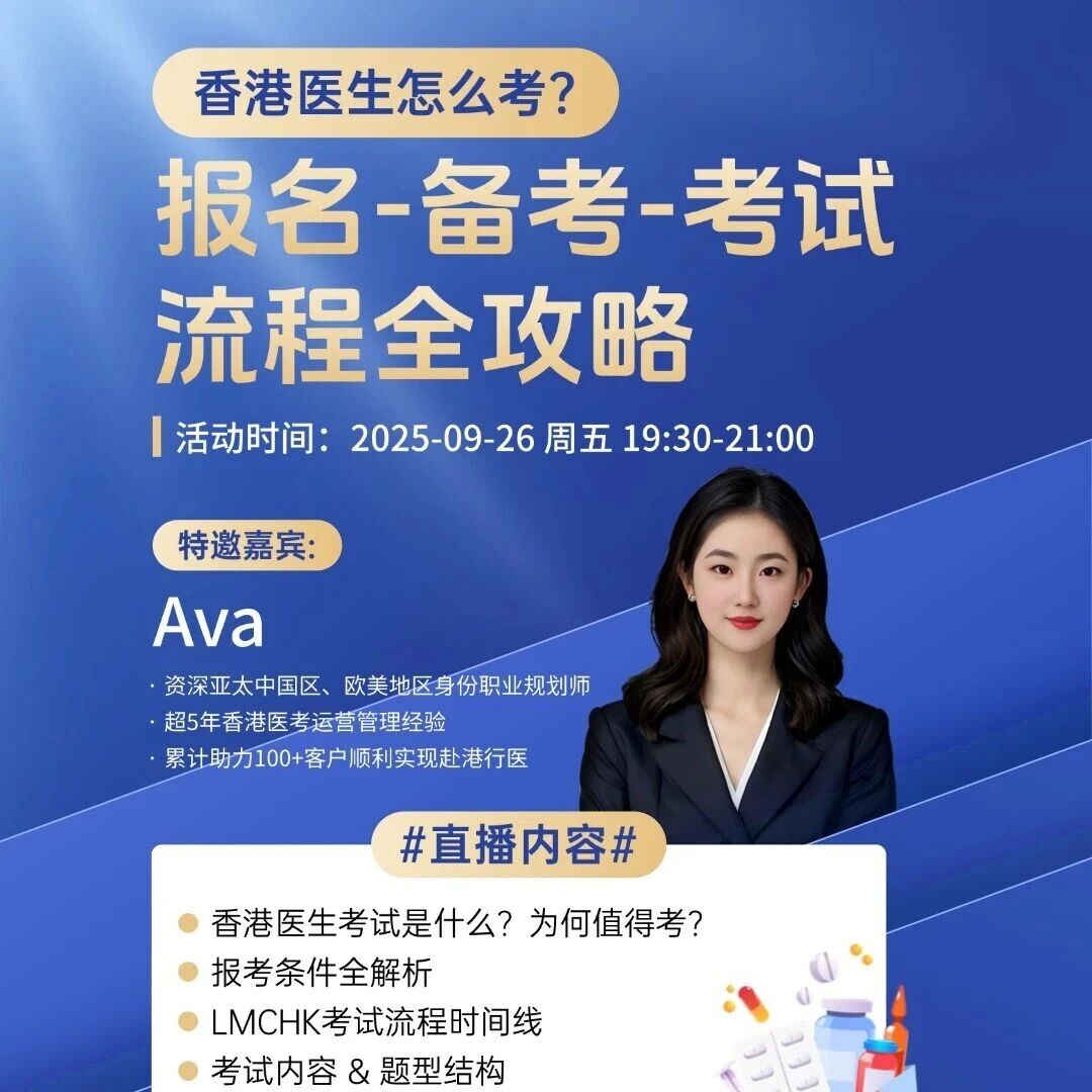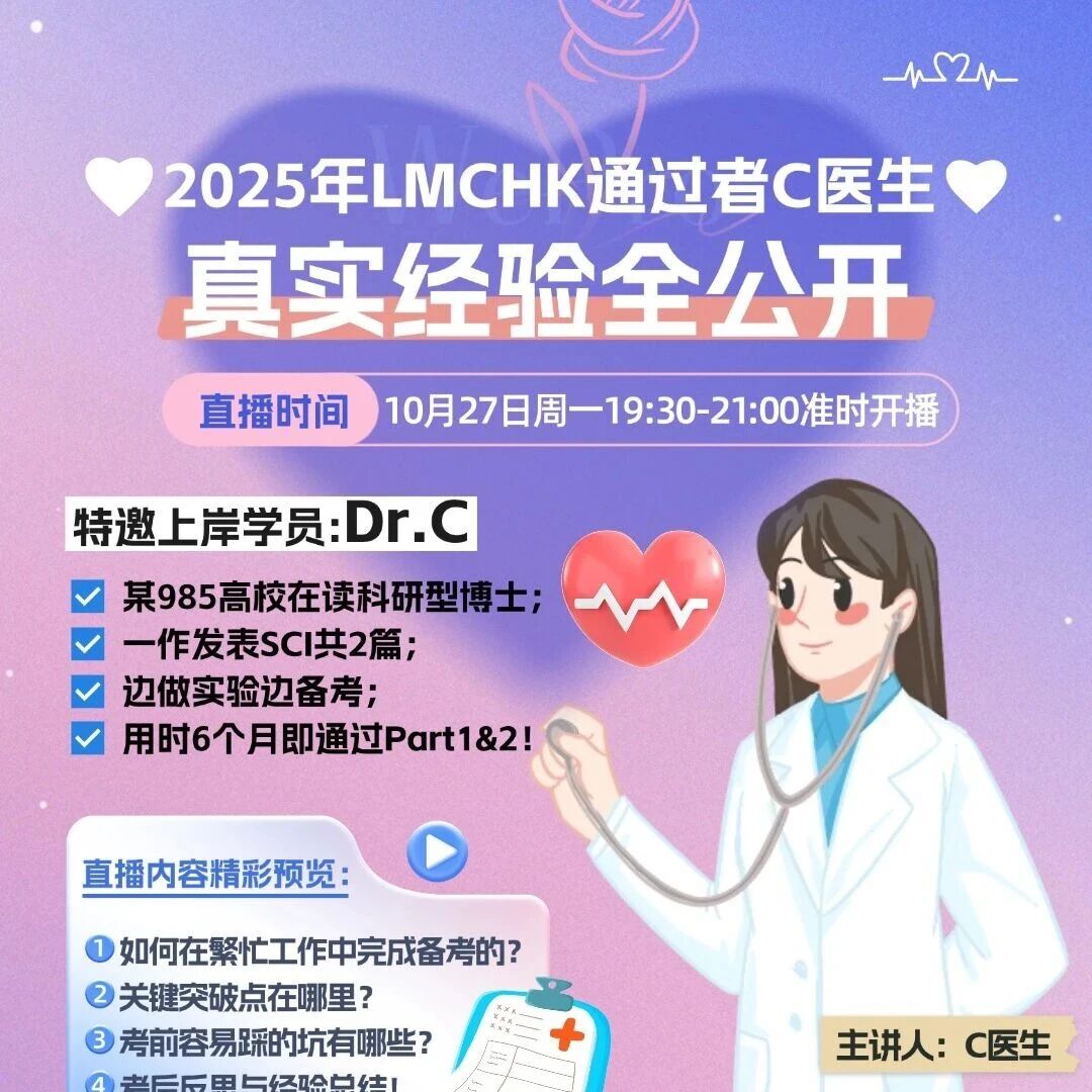 📢香港医生怎么考?"报名+备考+考试"全流程攻略!香港医生LMCHK考试报名通道已经开启!本次直播将带大家梳理报名条件、备考策略、考试流程,帮你理清从报名到考试的每一步,让备考更高效、更有方