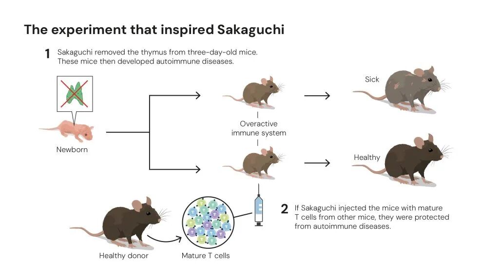 1980年代初,坂口发现切除新生小鼠胸腺会导致免疫失控,小鼠出现自身免疫疾病。进一步实验表明,某些T细胞能够保护小鼠免于疾病,这提示了“免疫保安”的存在。