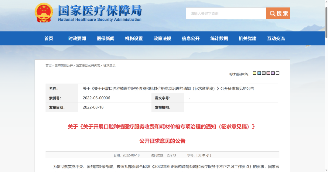 规范口腔种植医疗服务和耗材收费方式(图源:国家医疗保障局)