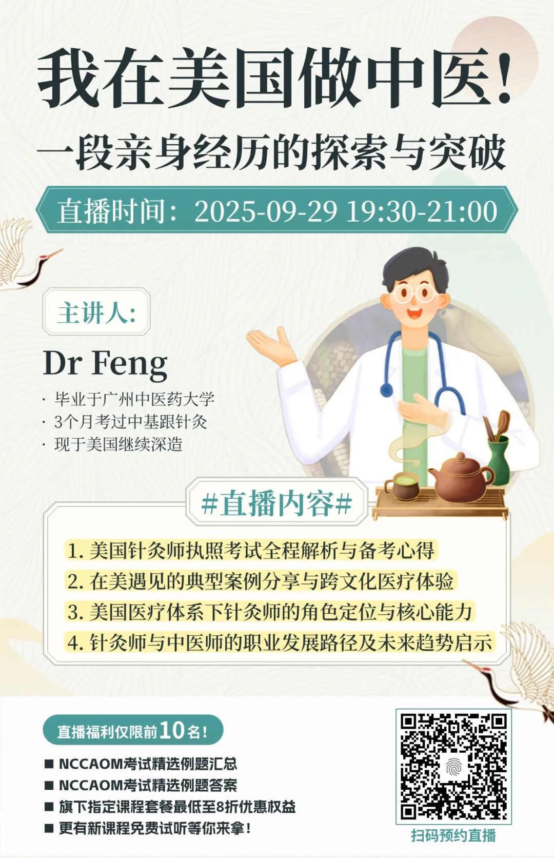 如果你也想了解在美国成为针灸师和中医师的完整路径,从学历、临床、考试到执业许可,每一步该如何规划、如何应对挑战,不妨来参加我们的直播,让你少走弯路,看清未来职业方向。