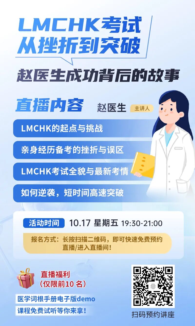 她将分享LMCHK考试的起点与挑战、备考误区、recall,以及如何在压力中调整心态、快速突破瓶颈。如果你也正在为LMCHK而努力,或者正准备踏上这条路,这一场直播,将是你了解全流程、理清方向的关键的一步。