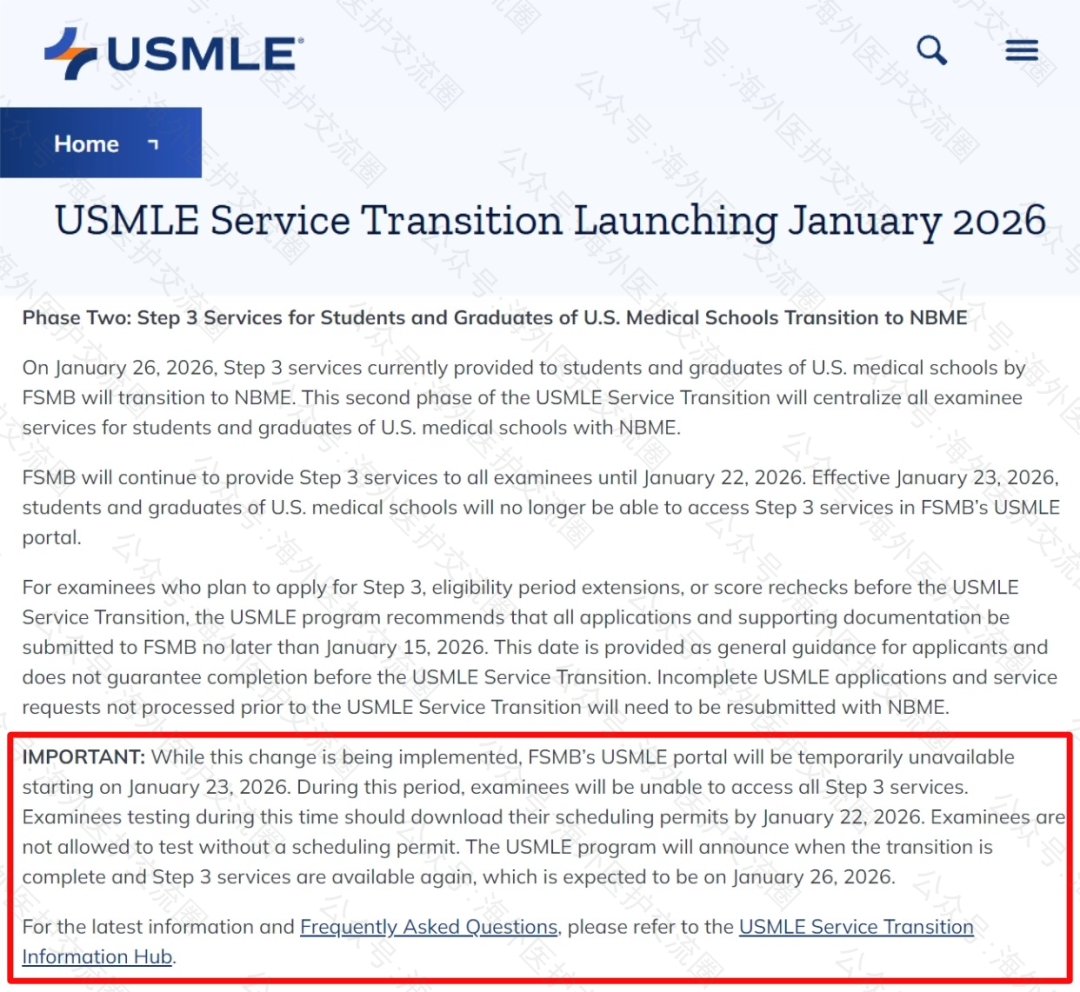 自2026年1月26日起,Step3服务将由NBME接手管理。同时,FSMB Step3平台将在1月23日进入维护期。