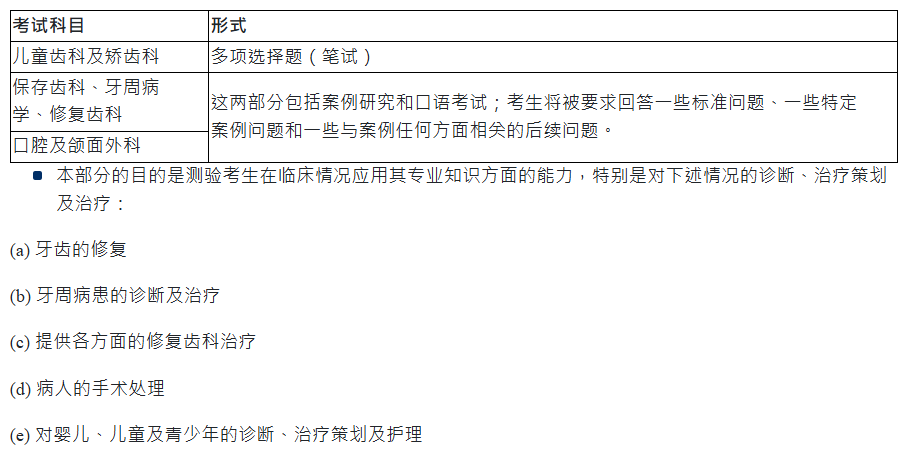 • 口腔及颌面外科:考核牙齿修复、牙周病诊治、各类修复治疗及手术处理能力,包括对婴儿、儿童及青少年的诊断、治疗策划及护理。