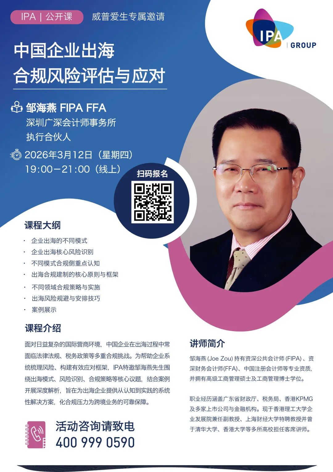 面对日益复杂的国际营商环境,中国企业在出海过程中常面临法律法规、税务政策等多重合规挑战。为帮助企业系统梳理风险、构建有效应对框架,公共会计师协会(Institute of Public Accountants ,IPA)特邀嘉域上市融资服务有限公司董事总经理邹海燕,围绕出海模式、风险识别、合规策略等核心议题,结合实战案例展开深度解析,旨在为出海企业提供从认知到实践的系统性解决方案,化合规压力为跨境业务的可靠保障。
