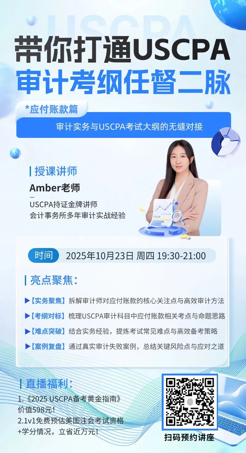 这场专为USCPA考生打造的审计直播课,绝对是你通关的秘密武器!识别下方二维码立即预约直播,10月23日我们不见不散~