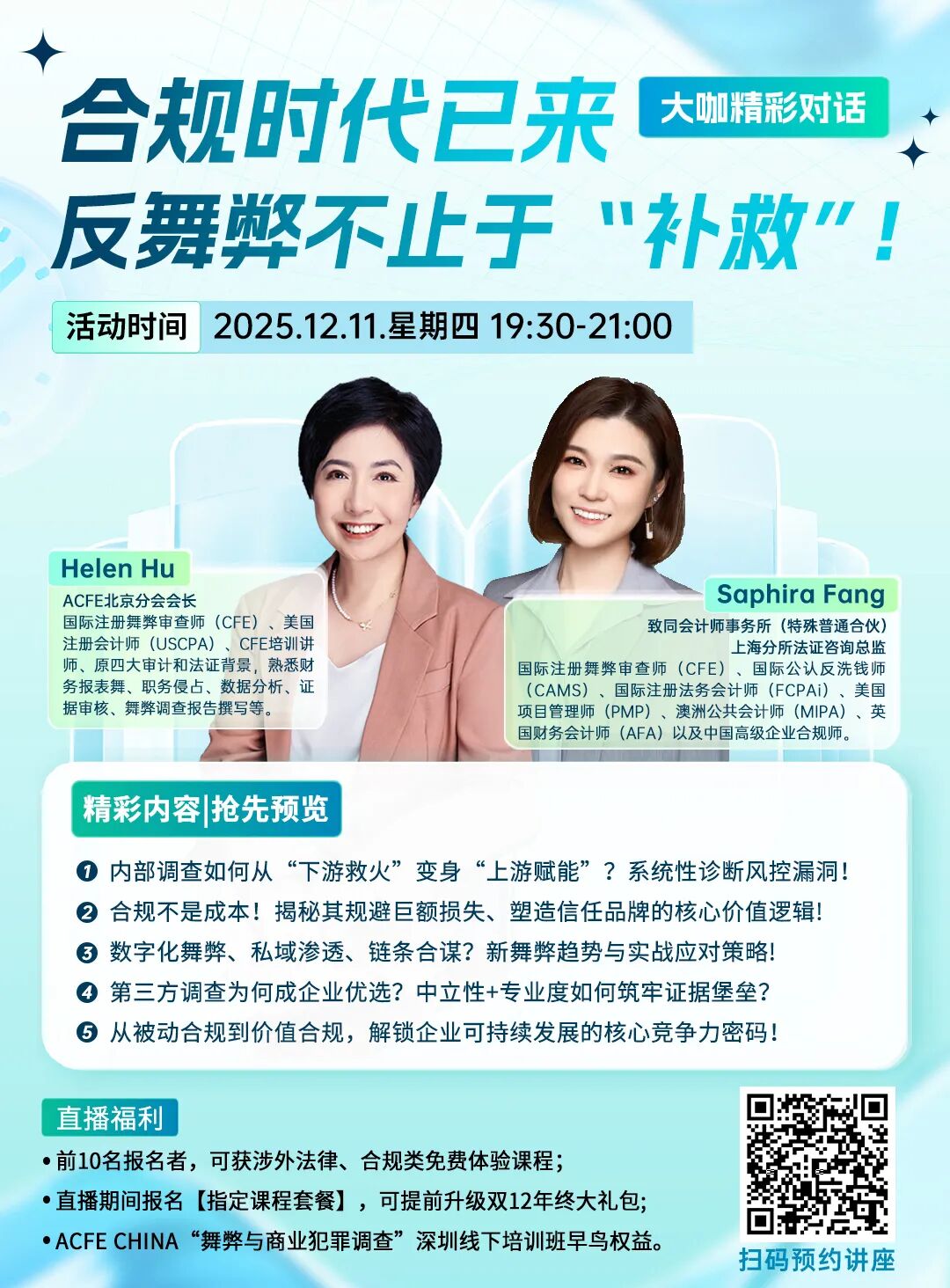 合规时代已来,反舞弊不止于“补救”!大咖精彩对话来了!为了让大家能更全面解“ACFE美国注册舞弊审查师”,特别邀请ACFE北京分会会长胡玉华Helen Hu和国际注册舞弊审查师方艺Saphira Fang与我们分享关于舞弊调查与企业合规反舞弊的精彩内容。欢迎扫码预约直播