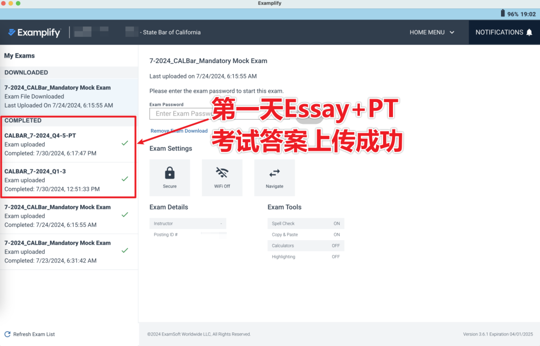 “Reminder for #CABarExam applicants: Take a few deep breaths. You worked hard and prepared for this moment. Good luck on Day One of your exam! You’ve got this!”提醒此次参加CABar加州律考的考生们:深吸一口气,为了迎接这一刻,你已经倾尽了努力,做足了准备。考试第一天,祝你好运爆棚!加油,冲鸭!需要注意的是,Day 1机考作答的答案,不得迟于8月1日中午12点(Pacific Time),上传考试答案文件包。建议考生结束第一天考试后出考场,回到酒店后,“务必务必务必”打开机考软件检查是否成功上传考试答案文件包,以免因小失大。下图为7月机考软件上传考试答案文件包后的成功状态显示,以及收到的确认邮件!此外,NCBE(美国律师考试委员会)规定,考试结束后,考生不得公开讨论考试内容,所以考完试的小伙伴,出来考场后,记得遵守考试规定哦!在社交平台上,公开询问考试内容是不可取的,大家切勿模仿!