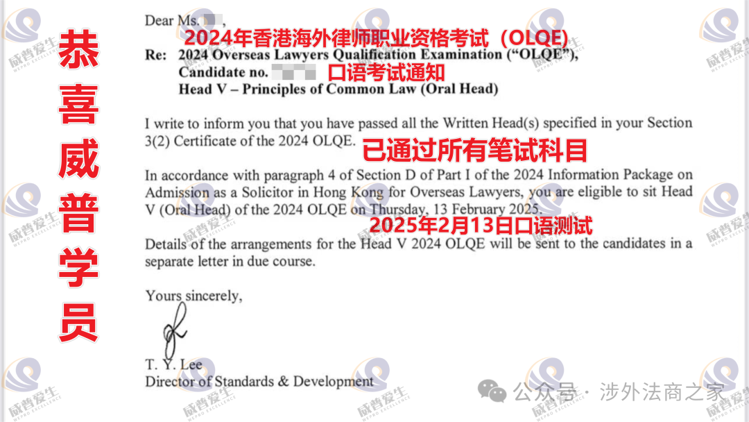 OLQE考试于每年2月开始报名,10月开始考试。2024年OLQE考试的成绩已出,今天在这里也分享一条喜讯:恭喜威普学员一次通过香港海外律师职业资格考试5门笔试,即将迎来口语考试收官之战!
