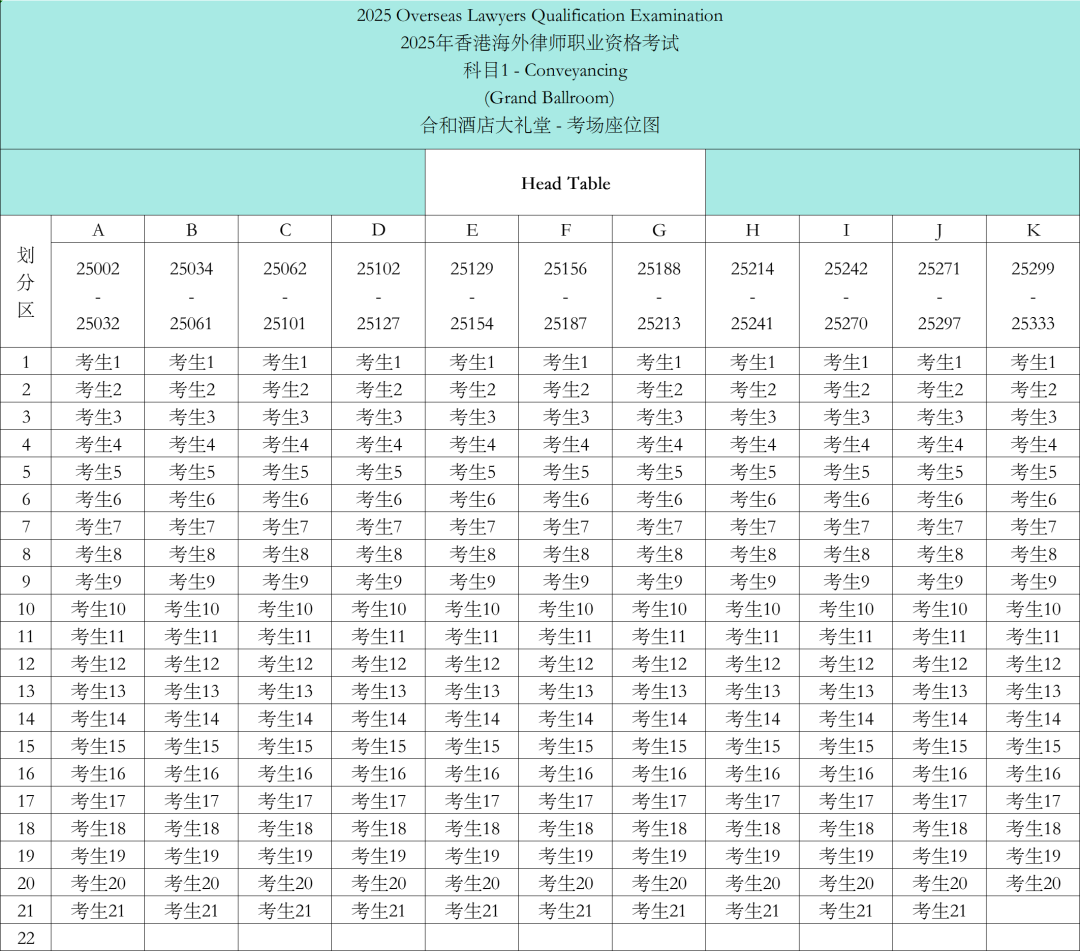 从座位划分区的安排来看,考场提供了11列座位,以字母A-K依次进行排序。每一列字母均安排了至少21个考位。考生考位的安排是官方根据符合报考资格的考生,在支付考试报名费后,再次进行考生号编排进而划分座位。