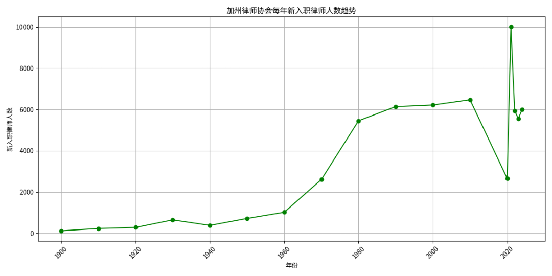 从历史数据来看,新入职律师的数量呈现出波动增长的趋势,尤其是在20世纪中后期和21世纪初期。