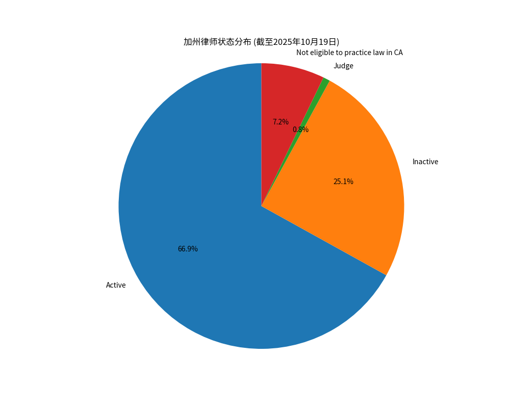 ✅活跃律师是主体:大多数律师处于活跃执业状态,构成了加州法律服务的主力军。