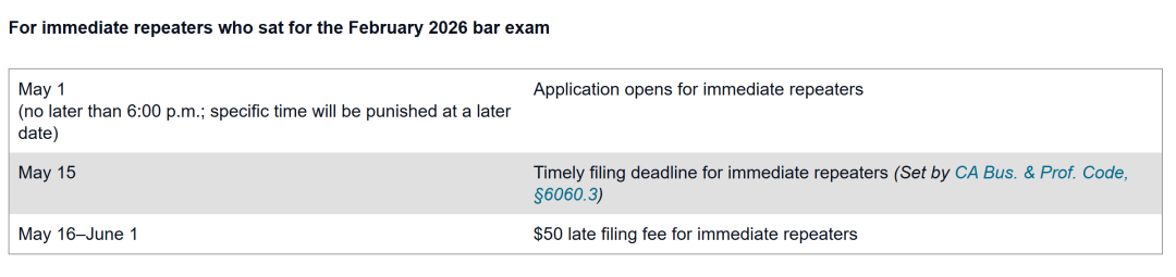* 对于仍有资格享受2025年2月律师资格考试豁免的申请人,如果在申请截止日期前提交申请,则不会收取考试申请费。在 2026 年 2 月考试期间缺席任何一场考试的申请人,将适用与首次申请人相同的申请截止日期和适用的滞纳金,而不是与立即重考者相同的截止日期和滞纳金。