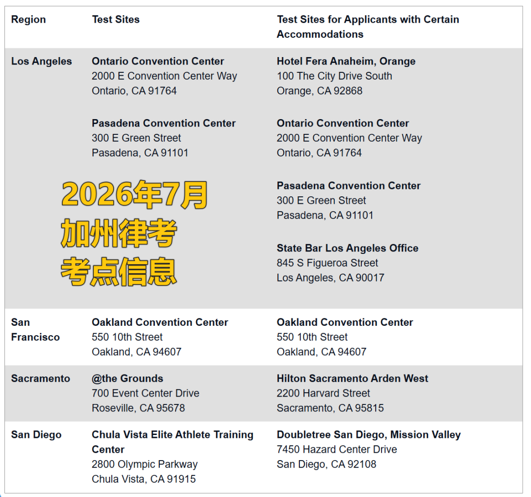 加州律师协会正在敲定2026年7月律师资格考试的考场合同。以下是预计的考点列表。请考生注意,此列表可能会有所变动(其中Chula Vista Elite Athlete Training Center暂未出现在实际考点选项中)。此外,加州律师协会正在积极争取更多考点,一旦确认,考点将立即添加到列表中。