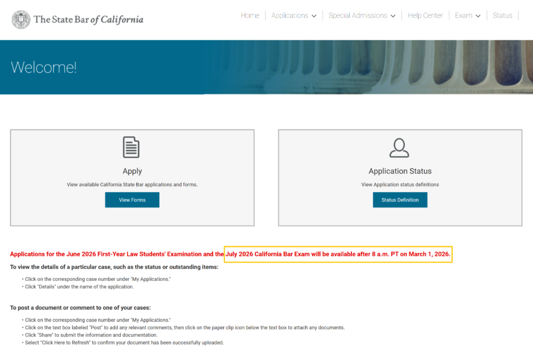 下一步,你就可以前往考生门户:https://admissions.calbar.ca.gov/s/login/