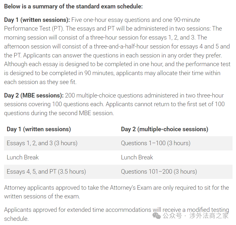 加州律考包括两个完整的考试日。考生每天上午须在8:20前就座,考场工作人员宣读考试说明后考试立即开始。