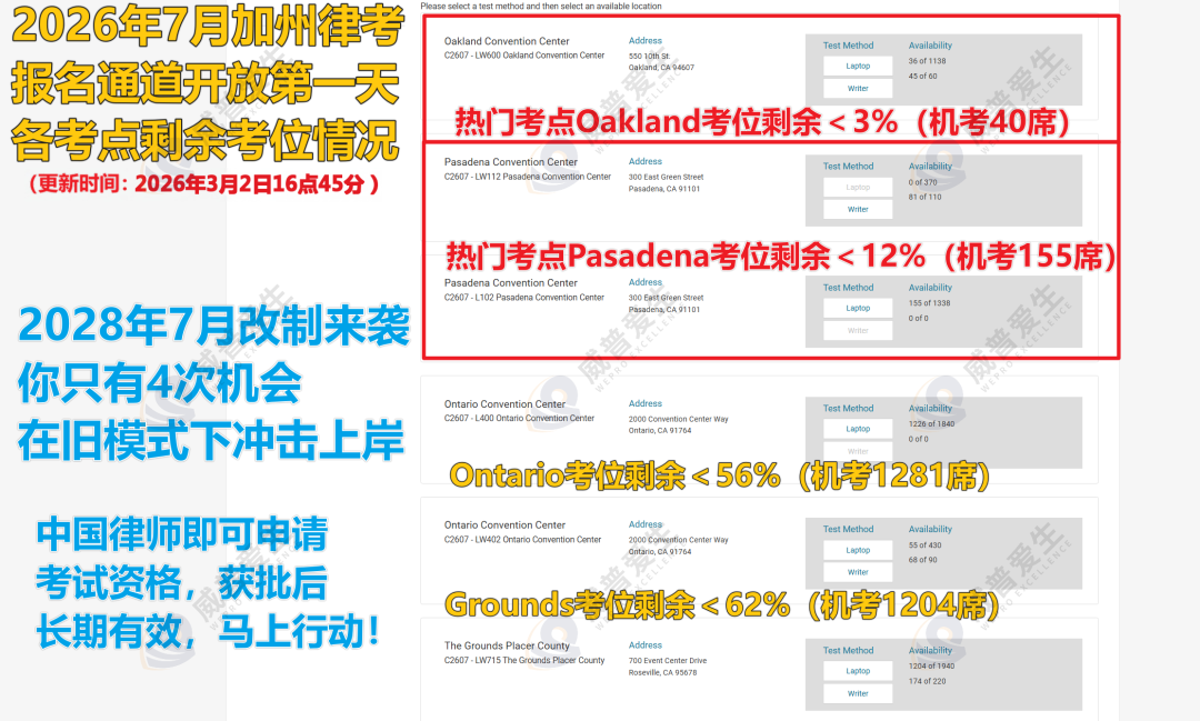 小伙们,北京时间2026年3月2日凌晨,加州7月律考报名通道准时开启,你们都抢到心仪的考点了吗?截至发文,热门考点例如Oakland、Pasadena已经面临剩余考位要见底的状态,有需要(符合考试资格)的小伙伴们,今天务必抓紧速度了!