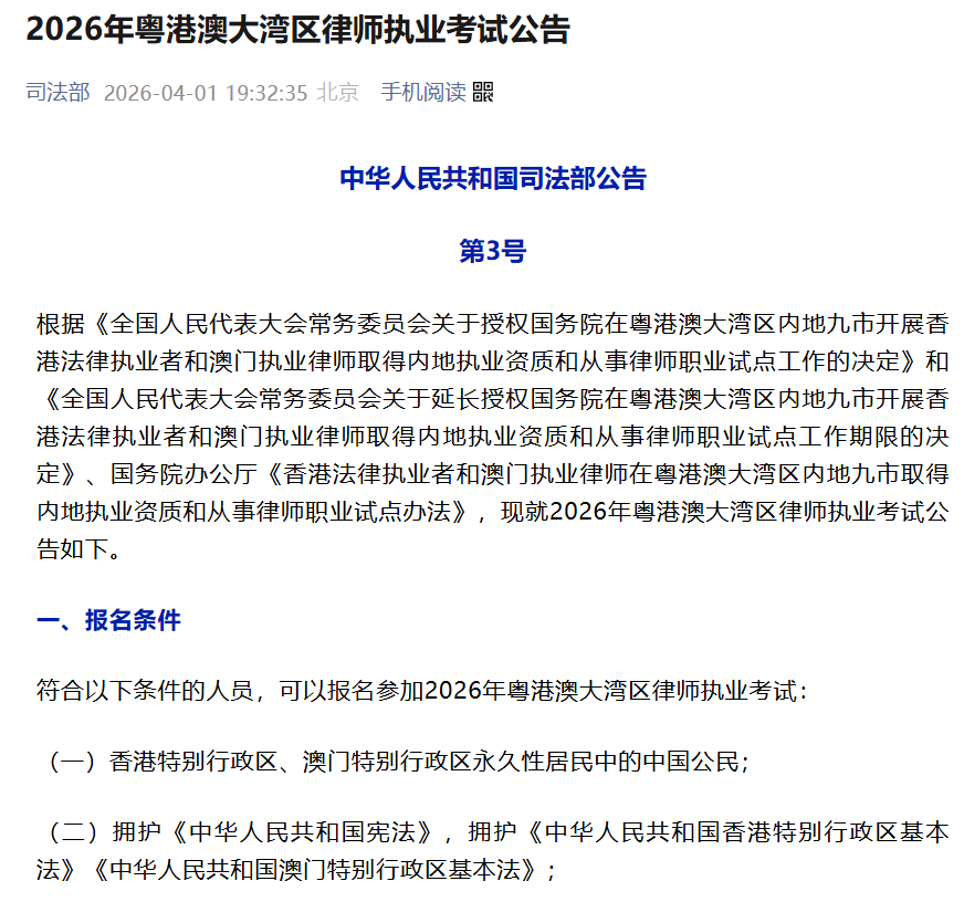 近日,司法部发布2026年粤港澳大湾区律师执业考试公告,进一步推动粤港澳大湾区法律服务领域深度融合发展。