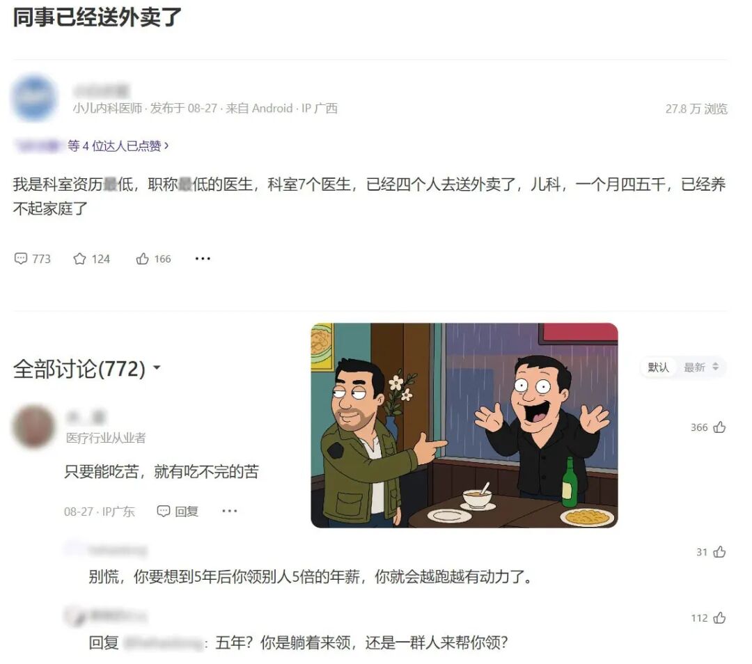 这不是孤例。前不久,一位医生在论坛发帖:我们科四个医生都去跑外卖了,我属于科里资历较浅的,一个月4K左右,真的撑不起一个家。
