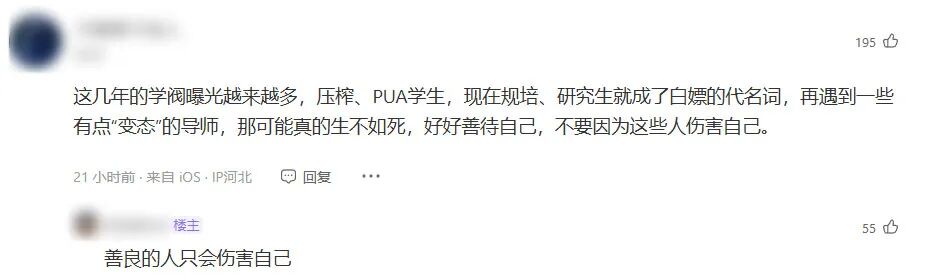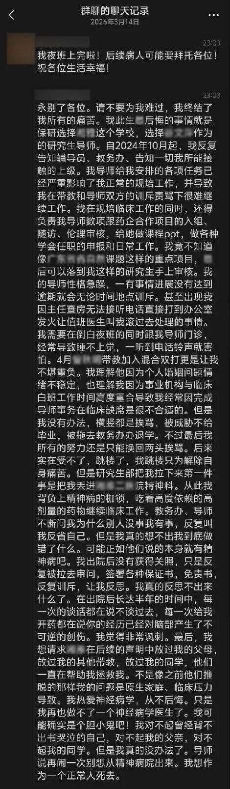 网络上流传的一段长文中,这位研究生提到自己在读研与规培期间承受了大量压力,包括临床任务、行政事务、导师安排的项目材料等。这些内容仍需要调查确认,但评论区出现的大量医生留言,却让很多人产生一种熟悉感。